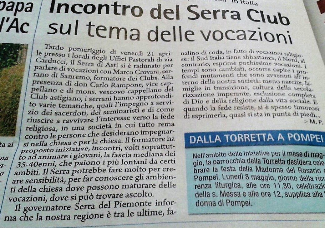 In occasione del "Pranzo dei poveri" il Serra Club Asti ha promosso il Premio la memoria della vocazione, per portare a conoscenza il valore e la preziosità del dono della "vocazione".